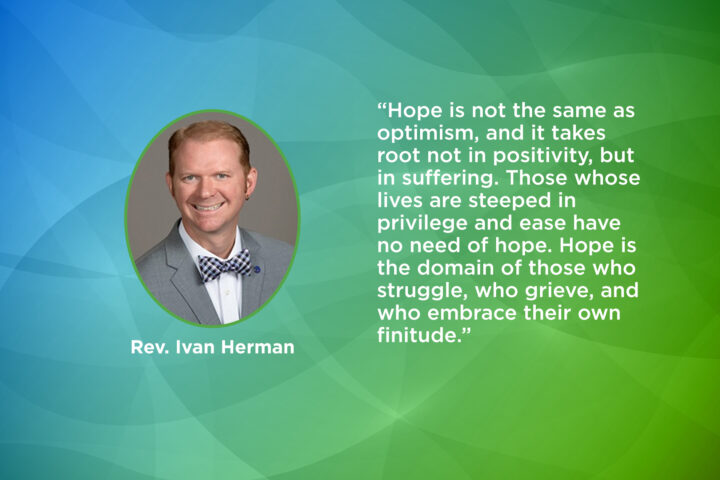 Hope is a heck-of-a-lot better outcome to distress than the anxiety, pessimism, or the snarky-ness endemic to my generation—okay, all our generations! Hope is not the same as optimism, and it takes root not in positivity, but in suffering. Those whose lives are steeped in privilege and ease have no need of hope. Hope is the domain of those who struggle, who grieve, and who embrace their own finitude.